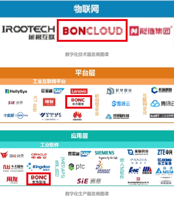 除入选中国数字化转型服务商TOP100外,东方国信还入选了数字化生产服务商图谱平台层-工业互联网平台以及应用层-工业软件板块。东方国信云BONCLOUD入选数字化技术服务商图谱板块。