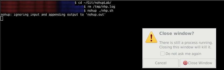 请注意,nohup 没有将进程转移到后台,它只是拦截 SIGHUP 信号。命令运行后,当你关闭终端的时候,会弹出一个警告,告诉你有进程正在运行,你可以根据需要选择确定关闭。