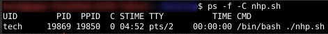 注意图中显示的 PPID,这是父进程ID。当关闭终端的时候,PPID的所有子进程都收到了 SIGHUP 信号(nohup命令除外)。然后父进程终止,使用 nohup 的nhp脚本成为了孤立进程。当一个进程被孤立时,它会自动将 assign 1(systemd 或者 init)作为父进程,如下图,再次打开终端时关于nhp的运行信息: