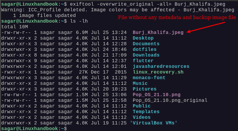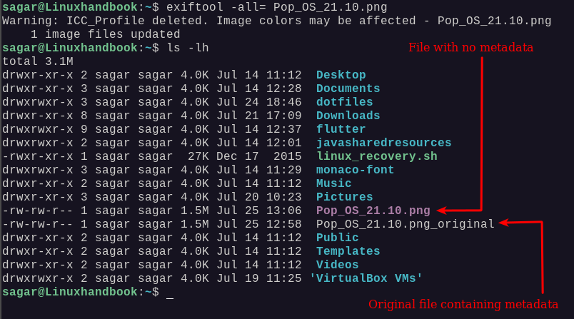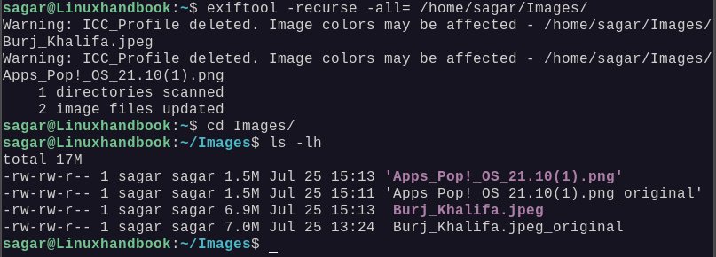 要删除元数据,需要使用 -all 选项。它将创建一个没有元数据的图像副本,原始文件将被重命名,并在文件末尾附加“_original”。