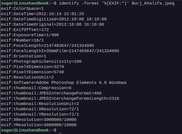 安装完成之后,就可以使用 ImageMagick 查看图像的详细信息了。要查看 exit 数据,可以使用如下语法结构: