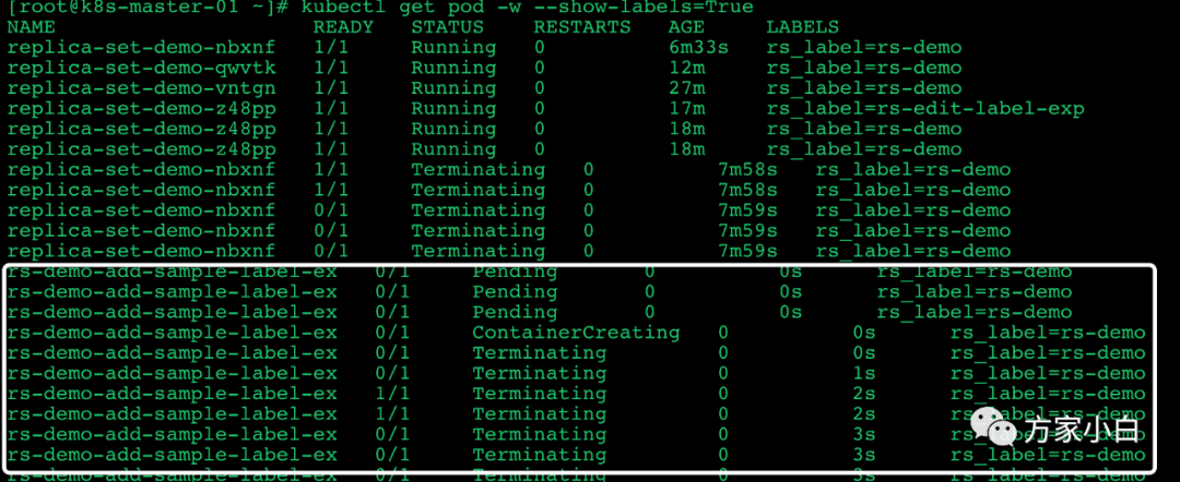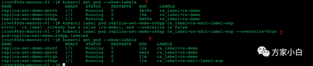 的标签。通过命令 kubectl label pod replica-set-demo-z48pp rs_label=rs-edit-label-exp --overwrite=True