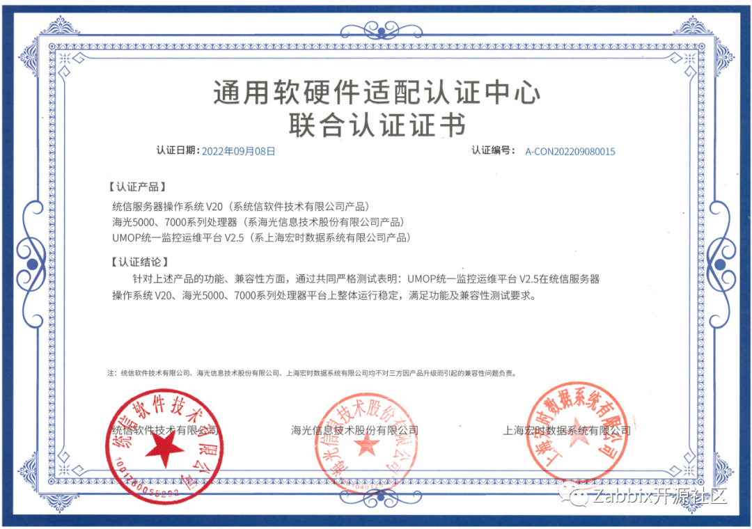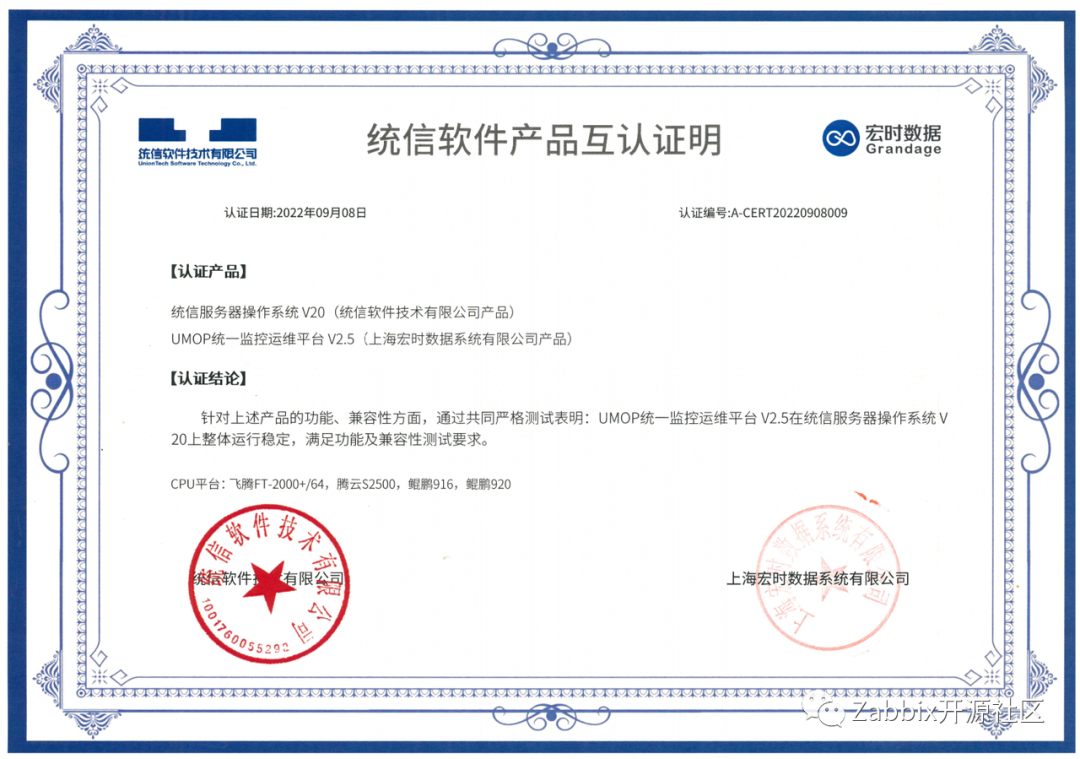 2022年9月,“UMOP统一监控运维平台”与统信软件技术有限公司旗下统信服务器操作系统V20,以及海光信息技术股份有限公司旗下5000、7000系列处理器完成产品兼容互认证。经过三方一系列全面严谨的认证测试后,三方认定产品互相兼容,性能卓越,且整体系统运行稳定,满足功能及兼容性测试要求。