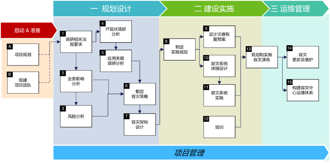 NTT Ltd.岱凯为企业提供的全生命周期的Business Resilience服务通常分为三个阶段十五大模块来帮助企业构建整个业务连续灾备体系(如图):