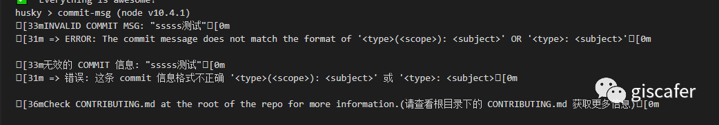 脚本可以参考 Angular 工程的 commit-msg.js,当 git message 不符合规范的时候,提交时检测不通过会有如下提示: