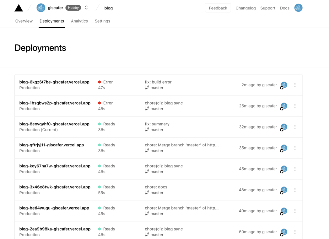 如下图是 Vercel 部署的 blog 项目的工作流执行情况。