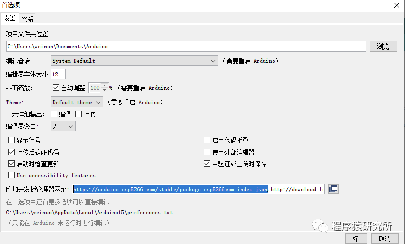 下面介绍如何采用 Arduino IDE 进行开发,毕竟 Arduino 的生态是非常好的,首先需要去 Arduino 官方网站下载 Arduino IDE, 并且安装完成,然后打开 文件 -> 首选项 添加:https://arduino.esp8266.com/stable/package_esp8266com_index.json
