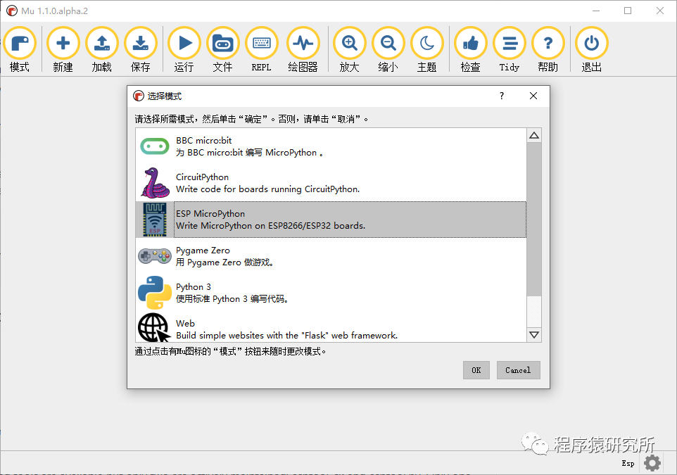 在菜单栏模式中选择 ESP MicroPython, 首次安装选择模块最好重启一下 Mu。