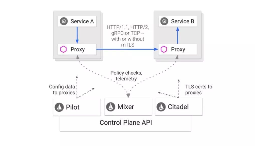 可以看到,Istio 就是我们上述提到的 Service Mesh 架构的一种实现,服务之间的通信(比如这里的 Service A 访问 Service B)会通过代理(默认是 Envoy)来进行。而且中间的网络协议支持 HTTP/1.1,HTTP/2,gRPC 或者 TCP,可以说覆盖了主流的通信协议。