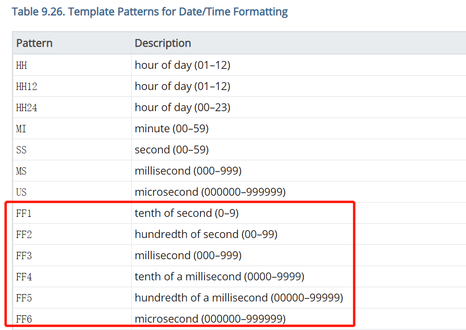 时间格式,PostgreSQL 13 版本的日期格式中新增了对FF1-FF6