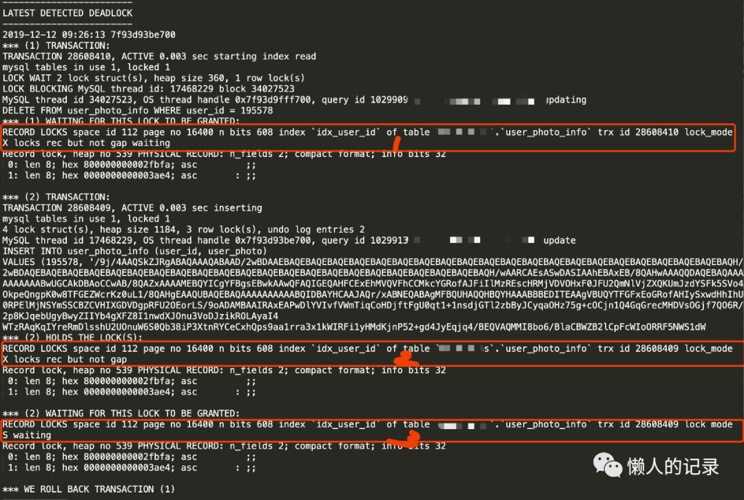 事务28608410 , 申请X类型记录锁时,发生了锁等待,对应的记录就是user_id=195578这条(16进制的2fbfa就是195578)