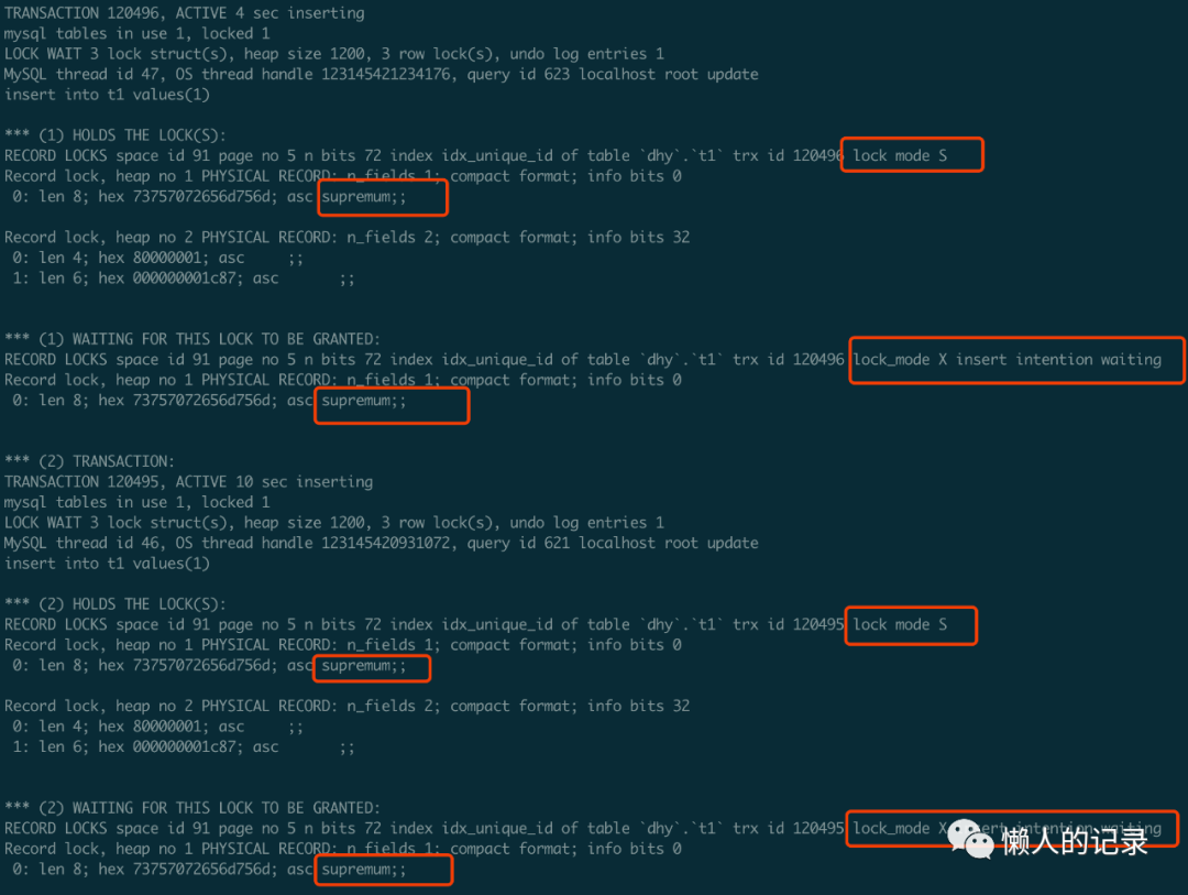 这里事务120495申请插入supremum上的插入意向锁时发生了锁等待,因为事务120496在supremum上添加了S类型的Next-Key Lock,并且事务120496申请supremum上的插入意向锁时发生了冲突,这样就造成了死锁。