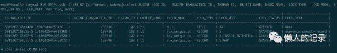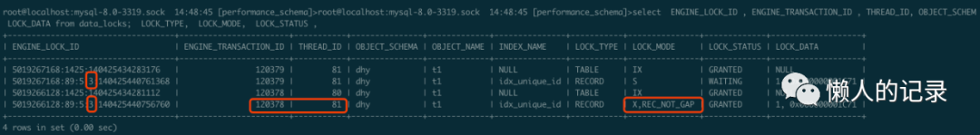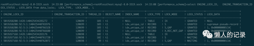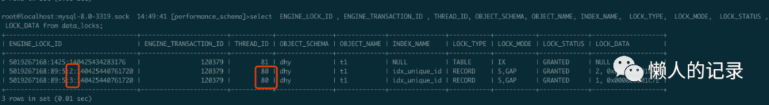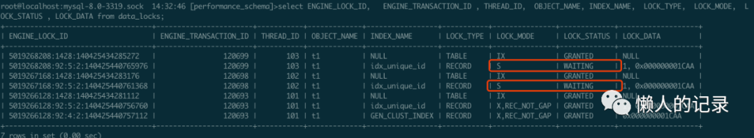 没有出现死锁情况从上锁信息来看,像是session2和session3中,有一个执行的很快,首先在id=1这条记录上添加了X类型的记录锁,导致另外一个会话申请S类型的Next-Key Lock时发生了锁锁等待,从而没有导致死锁发生。但当中还有一点没有搞明白的是,为何S类型的GAP锁会发生锁等待,并且thread_id看起来也很奇怪。