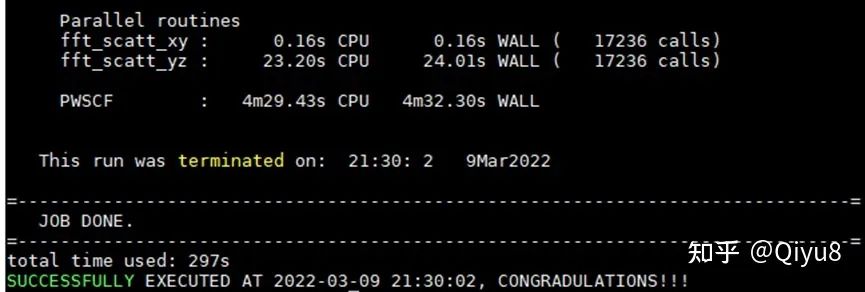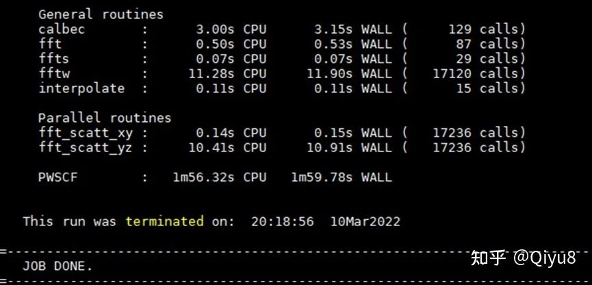 几分钟后应该可以看到“JOB DONE”字样,经过14次SCF自洽运算我们就可以得出原子间的能量值,到这里你已经体验了一遍HPC应用的安装运行全流程了。