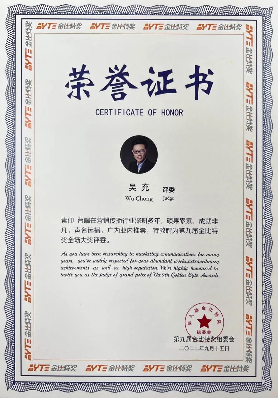 2022年9月15日,由广告主传媒主办、中国传媒大学广告学院学术支持的第九届金比特奖颁奖盛典暨直播与短视频营销峰会在北京举行。活动围绕“新局势·新营销”,对行业发展趋势进行了探讨并对行业优秀案例进行了评选和表彰,国双数字营销事业部总经理吴充以评委身份受邀出席。