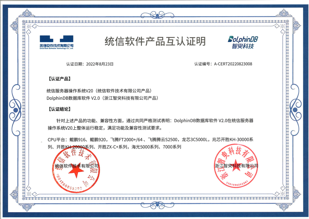 近日,DolphinDB 数据库软件 V2.0与统信软件技术有限公司的“统信服务器操作系统 V20(CPU:鲲鹏916、鲲鹏920、飞腾FT2000+/64、龙芯3C5000L等10个平台)”完成产品兼容互认证。经过双方共同严格测试,DolphinDB 产品运行稳定,满足功能及兼容性测试要求。