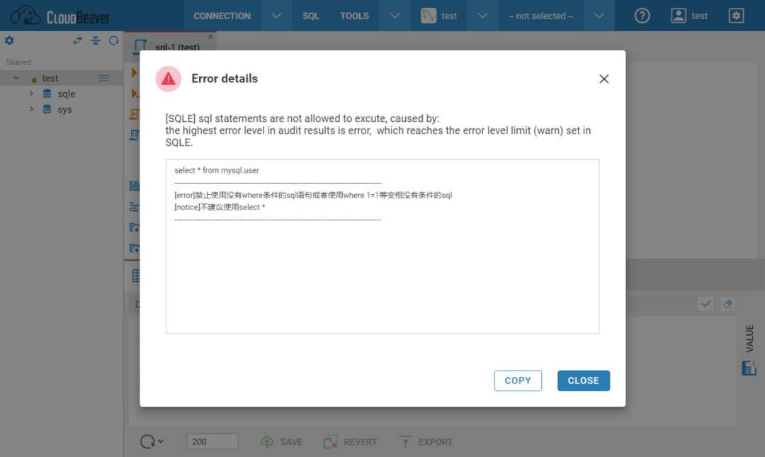 向数据源下发在执行SQL时会进行审核, 并拦截不合规的SQL,执行后会有如下图所示的错误提示: