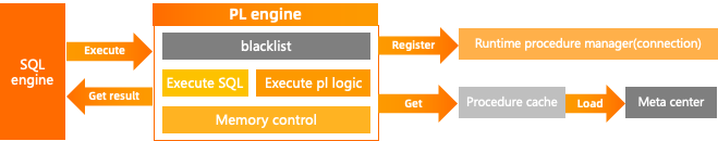 存储过程会被持久化到Meta center中,按需加载到计算节点中执行,SQL相关的执行逻辑会发送到SQL engine中执行,然后获取执行结果,存储过程的控制流程等相关的逻辑会在PL engine中执行。
