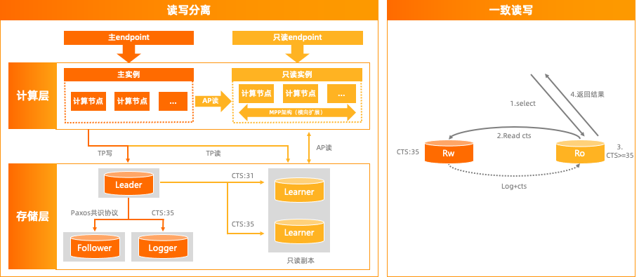 PolarDB-X会基于CTS+Log 在主副本和只读副本间做一致性复制,基于CTS+TSO确保在只读副本上读到已经提交的最新数据。在一致性读的能力上,配置了规则读写分离和智能读写分离的能力,业务可以更加透明的使用。