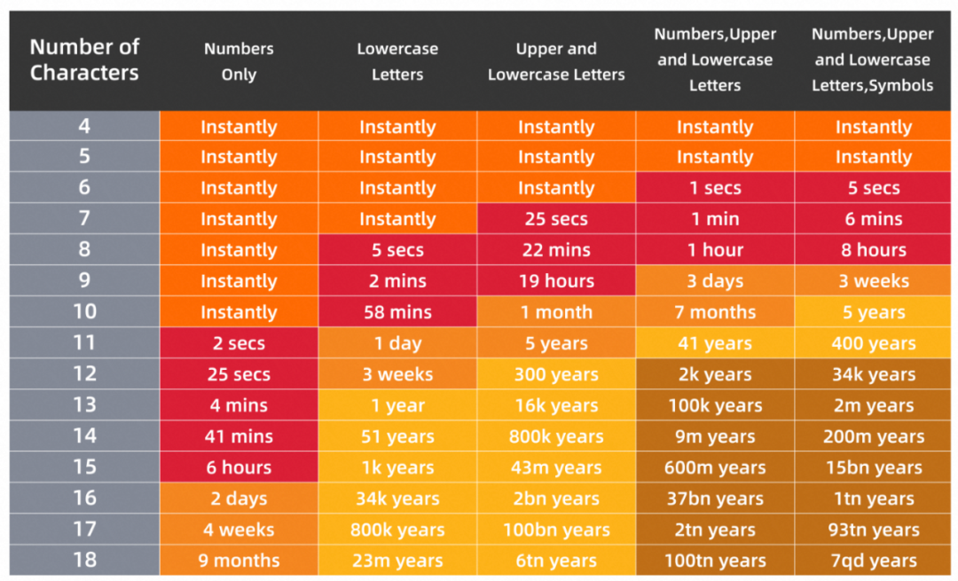 如果您采用了11位组合字符密码,那在现有技术条件下,需要400年才能破解。