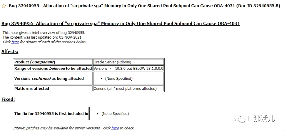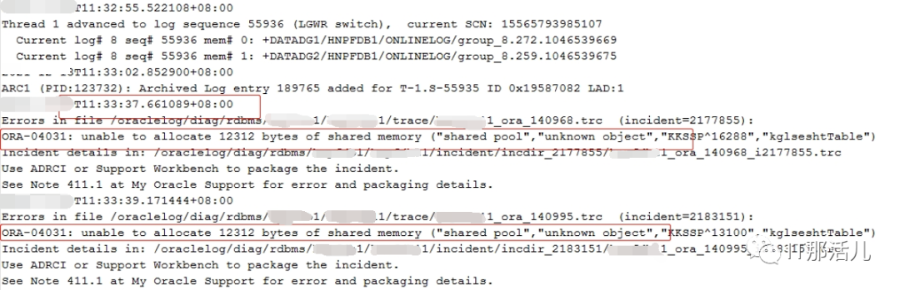 事后回溯分析,发现节点1 在11:33左右突然出现大量library cache相关等待事件:11:33左右开始连到数据库的应用会话数明显突增:查看等待事件发现主要是latch: shared pool等待事件:查看DB ALERT日志发现大量ORA-4031报错。继续查看db alert日志发现11:43:33开始pmon进程获取latch一直失败,12:15:17由于pmon进程挂死导致实例宕掉。查看pmon trace日志发现pmon一直在等待内存分配。检查12:23 alert日志出现IO ERROR:无法打开磁盘。12点33分左右,有严重的IO性能问题,经分析为内存资源耗尽导致IO性能严重下降。查询资料文档发现,应用19.13PSU后,疑似触发数据库内存Bug 32940955以及BUG 33415279、BUG 33225584。1)打patch 32940955,让"so private sga"分布到各个Sub Pool里去。2)打patch 33415279,避免"pga accounting"的内存泄漏。3)patch 33225584,解决了共享池内存释放的调用kghfrunp时超过1秒的 'latch: shared pool' 等待的问题。4)需设置如下2个隐含参数