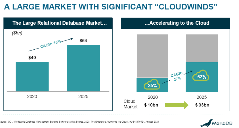 根据 IDC 2021年8月发布的研究报告显示,在大型关系数据库的企业级服务市场中,其中云服务的份额占比将从2020年的25%提高到 2025年时的52%。那时,整个关系型数据库云服务市场的金额也将从2020年的100亿美金提升到330亿美金左右。而关于这点,我们从上面 MongoDB 飞速增长的云服务收入已经可以感受到这个趋势。