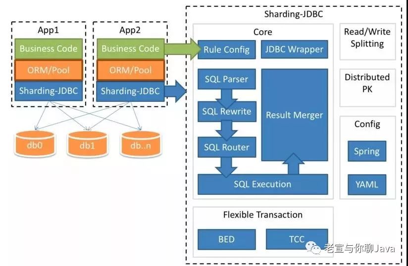 可以看到分片的实现是和应用服务器在一起的,通过修改 Spring JDBC 层来实现。