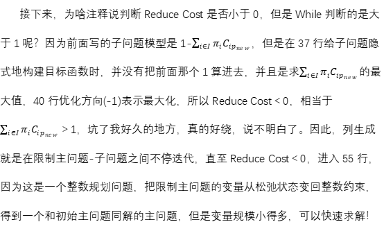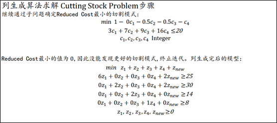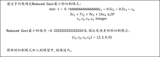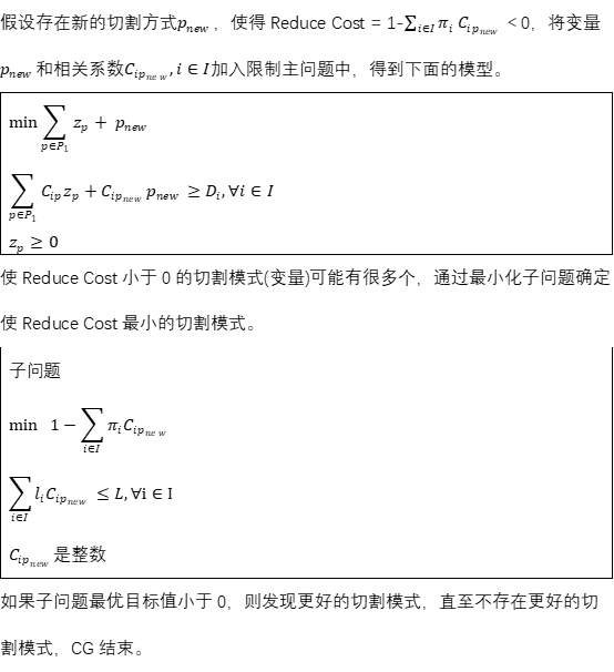Cost是什么的同学,回到最优性判断一节复习)。如果有,那么把这个变量的相关系数加到RMP的系数矩阵A中,就多了一列,所以叫列生成!!!。重复上面的步骤,直至限制主问题RMP的Reduce Cost都大于等于0。