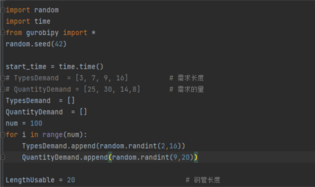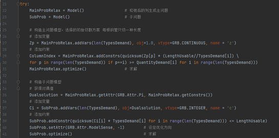 22行创建限制主问题,27行的addVars()会根据第一个参数,创建对应数量的变量,obj=1.0表示每个变量在目标函数中的系数是1.0,这种方式会自动写好目标函数,不需要像前面显式的再写一遍目标函数。29-30行添加和需求种类相同数量的切割模式(后面用例子说明),不需要枚举所有切割模式。31求解限制主问题,33-41行,注释结合子问题模型看,很清楚,不说了。