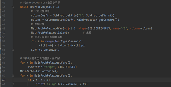 将下图中列生成结束后得到得模型的变量重新弄回整数约束,见列生成代码56-57行。