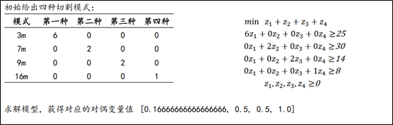 如下图所示,给出子集P1的初始切割模式,一共四种,和木材种类相同,列生成法的代码29-30行,限制主问题给出的切割模式就是这四种,变量松弛后获得右边的限制主问题,求解获得对偶变量的取值[0.166…,0.5,0.5,1.0]