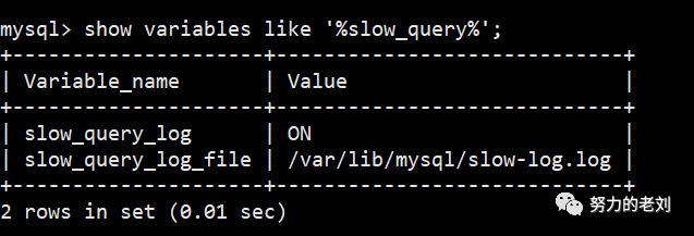 增加这些参数之后,重启MySQL,可以进行查询慢查询日志是否开启。
