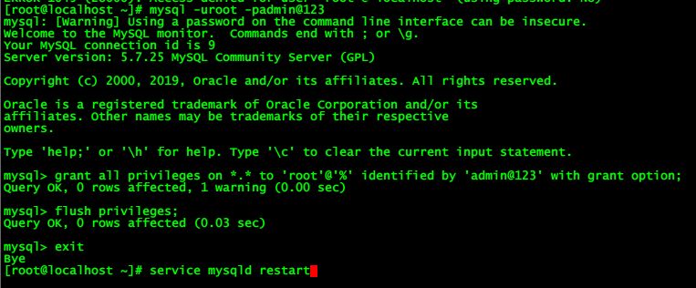 mysql>grant all privileges on *.* to 'root'@'%' identified by 'admin@123' with grant option;