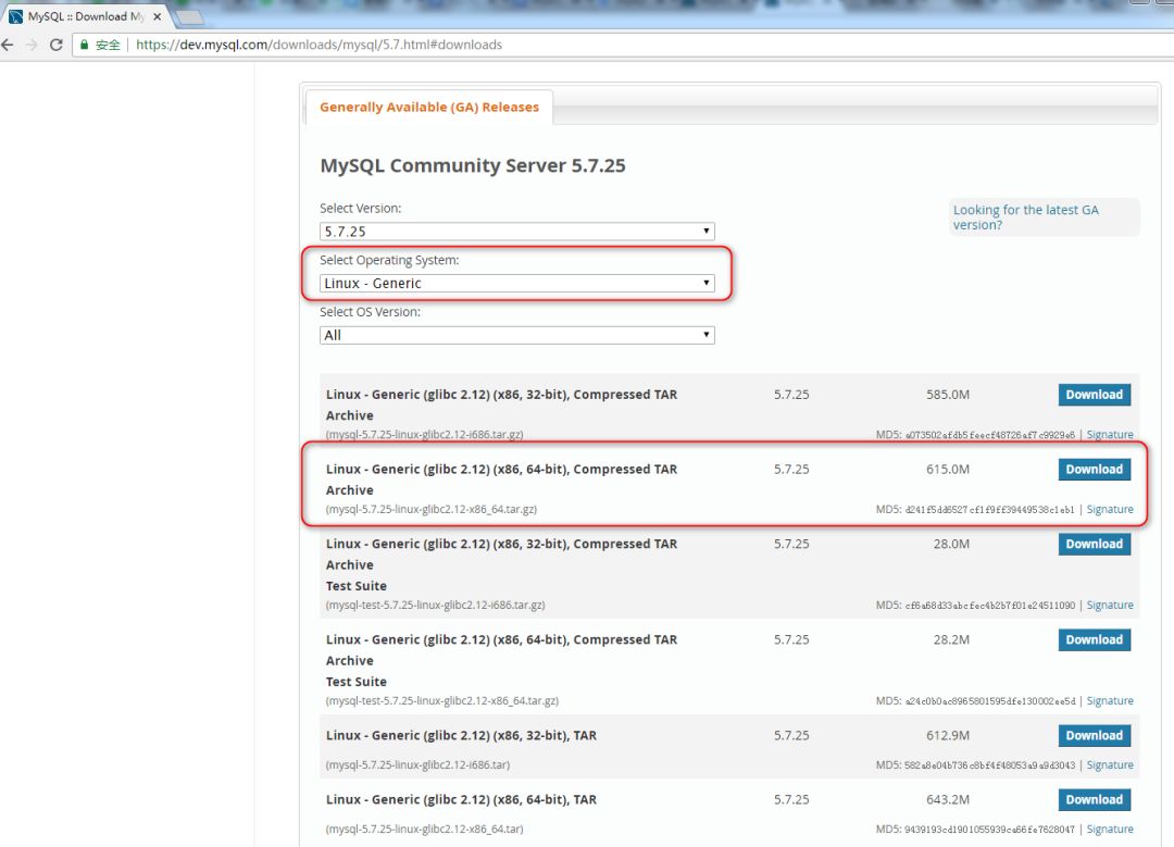 1、MySQL官网下载5.7.25的Linux 64位二进制版本