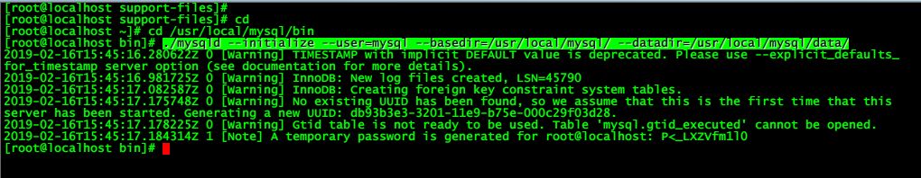[root@localhost bin]# ./mysqld --initialize --user=mysql --basedir=/usr/local/mysql/ --datadir=/usr/local/mysql/data/