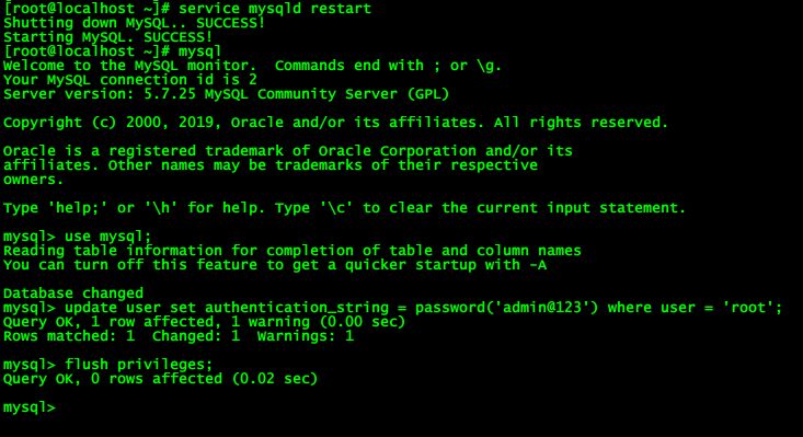 mysql> update user set authentication_string = password('admin@123') where user = 'root'