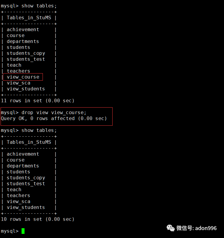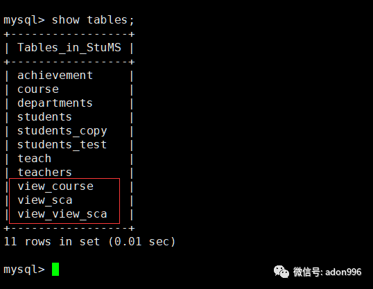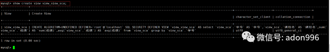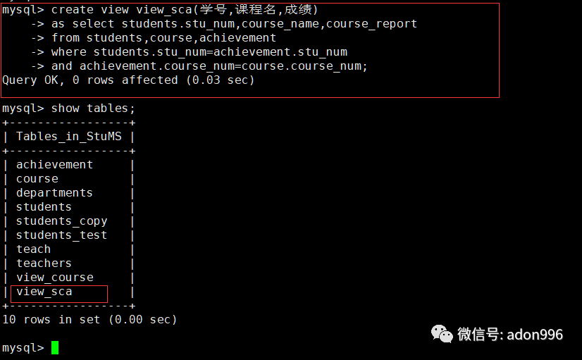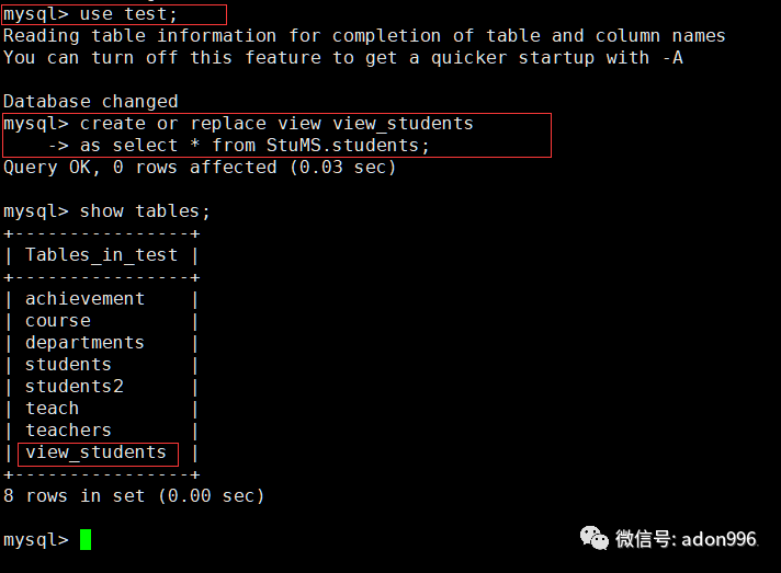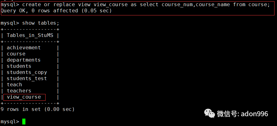 mysql> create or replace view view_course as select course_num,course_name from course;