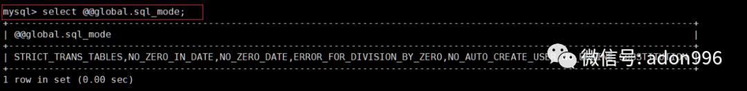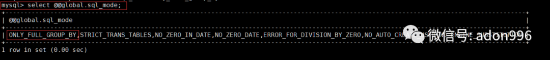 进入MySQL,查询 sql_mode,这里就没有了 ONLY_FULL_GROUP_BY 。