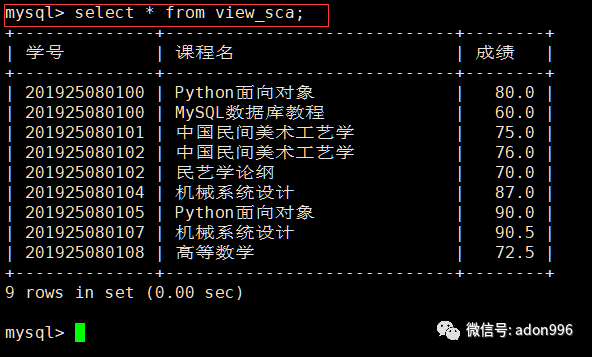 a、创建视图 view_sca,包括学号、课程名、成绩 。
