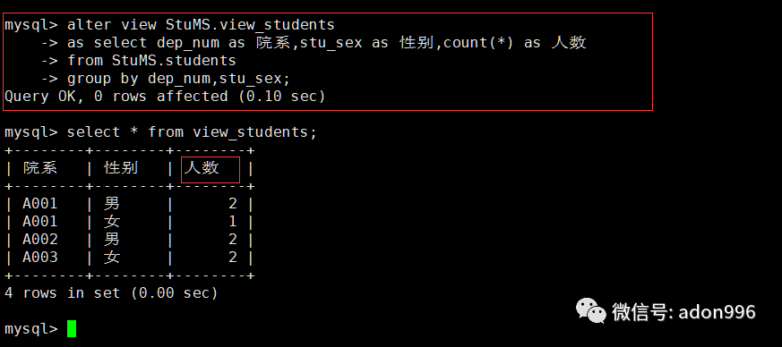 1、修改视图 view_students ,用 as 定义别名,并增加 ‘人数’ 字段,统计各个院系男女人数。