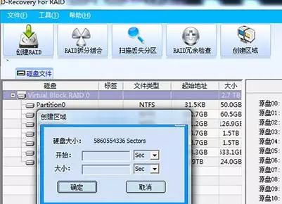 3、使用达思智能RAID数据恢复软件d-recovery for RAID进行RAID数据虚拟组合,并用创建区域的功能将两个LUN划分出来,直接提取数据,如图二(因数据高度保密,这里仅展示功能截图)
