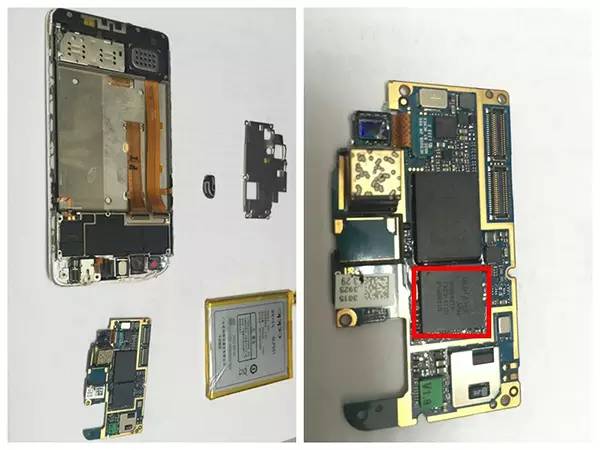 2、因为之前手机在维修点已经被完全拆修过,为了确认存储芯片是否被更换过,达思数据恢复与取证工程师决定拆开手机查看,如图二(红色方框中是OPPO R819T手机的MTK存储芯片)。该芯片没有发现明显的拆焊痕迹,应该没有被拆解过或者更换过。