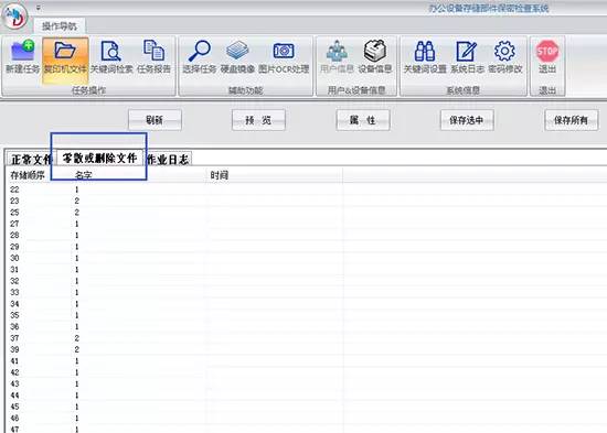 图八对比图三,多了“零散或删除文件”,这些文件实际上是数码复印机硬盘原来保存的文件,被用户端或者数码复印机的操作面板执行了删除操作,我们在数码复印机的控制面板或者在局域网中的电脑在线浏览,都看不到这些文件,而用DES-8880可以进行深度数据恢复操作,我们看到图八中被恢复出来的数据有很多,而这些文件也是重点检查的泄密风险的源头。