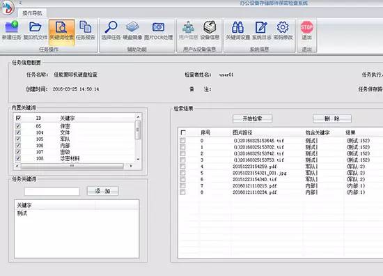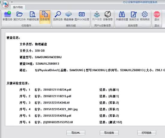 最后,对整个检查过程生成报告,报告的内容包括数码复印机的相关信息,敏感关键词及位置,操作日志等一目了然。