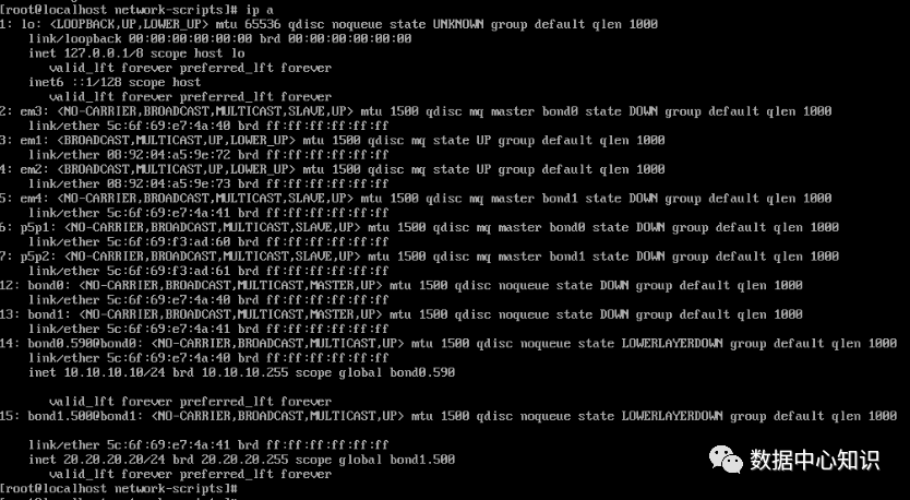 然后将四个万兆口两两绑定,具体的绑定方法,公众号前面有篇文章详细介绍,文章名《如何在一个小时内完成30台服务器本地yum源配置和25Gb网卡绑定》。唯一的区别就是绑定模式改为mode=6,或者改为mode=balance-alb,绑定后的结果如下: