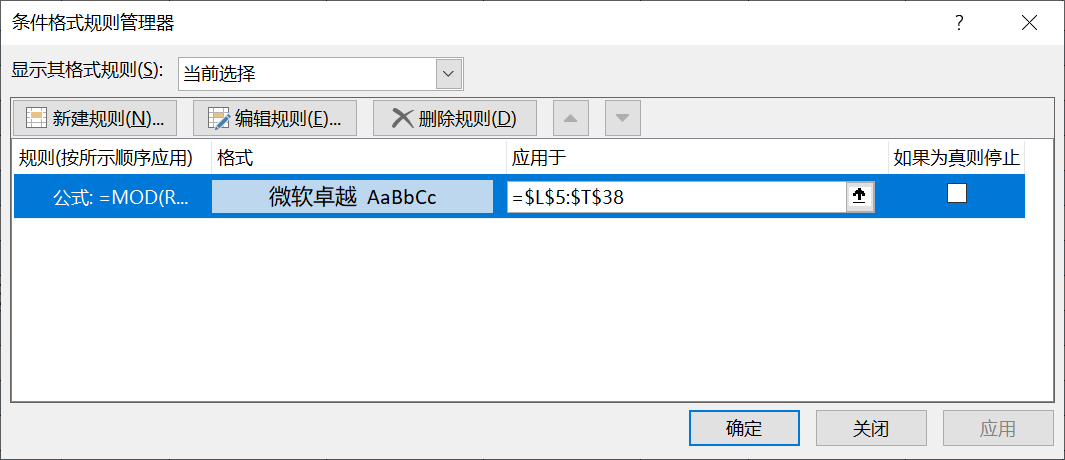 我们在【开始】---【条件格式】---【管理规则】打开后,可以看到我们刚刚设置的规则情况,当然这个地方可以设置多规则、更改规则、删除规则,各位可自行学习。