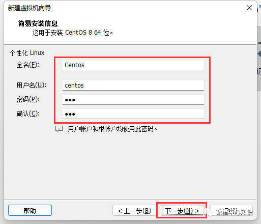 5. 虚拟机的命名和用户密码设置,点击下一步。