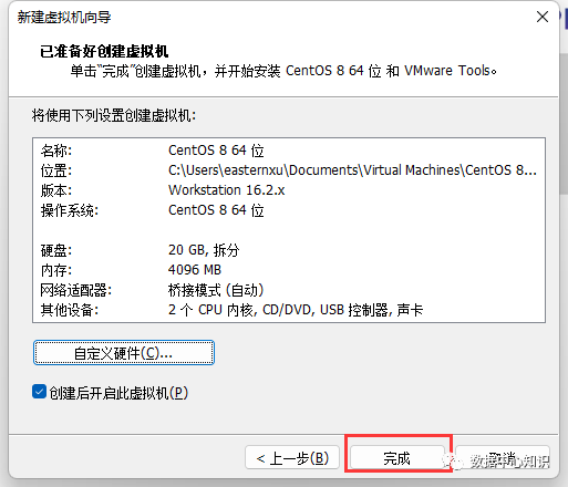 14. 点击完成,就开始安装我们需要的Centos8.3的虚拟机了。