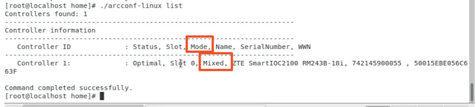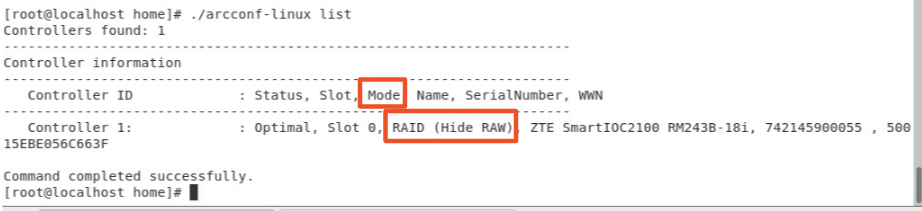 查询RAID卡控制器及运行模式。 执行以下命令,查看RAID卡ID及运行的模式,如下图所示。