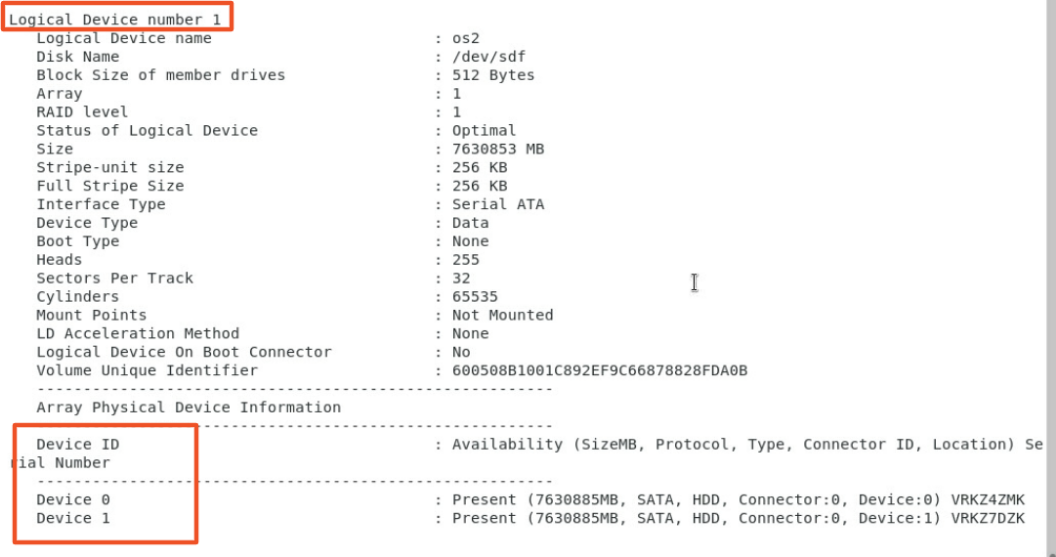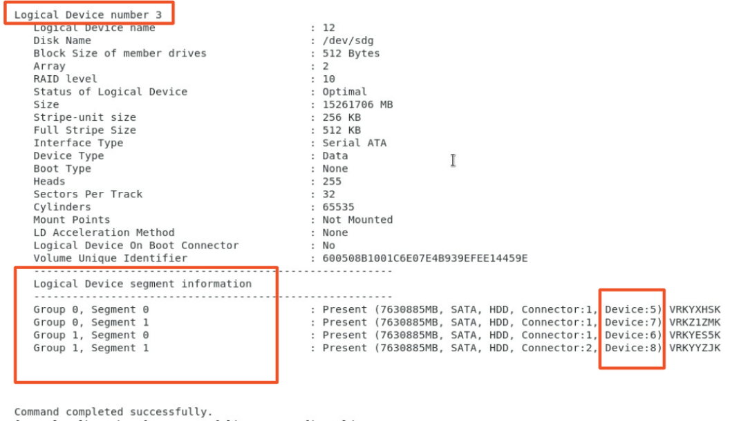 执行以下命令,查看RAID组信息,包含逻辑卷下的硬盘信息,如下图所示。